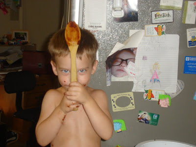 So I love, love, love, to bake, cook, and/or create food. Before I lived here at this circus tent I sometimes refer to as my "home" with the circus people that stay here that I sometimes refer to as my "family" I did a lot of creative cooking and baking. As a matter of fact, I've invented many recipes, but that's for another entry. Tonight I decided Jason and I would make brownies together, mistake number 1. I saw a really easy recipe on Everyday foods http://www.pbs.org/everydayfood/ for a brownie with cream cheese swirl that looked terrific (aside and an entry for another day as well, the recipe is fouled up, don't try it, you have to add the flour/cocoa mixture where is says "flour") anywho, I digress. Jason & I were really excited about our culinary venture that was about to begin. Trav had to mow, so it was just me, Jason, Maddie, Spock & Kirk, mistake #2. Chair comes into the kitchen, up goes M & J, Spock and Kirk sprawled out on the floor, chaos, Julia Childs herself couldn't have concocted something edible under these conditions. After several near altercations between M & J regarding whose stirring the above mentioned flour/cocoa mixture Maddie goes on my hip, mistake #, I can't remember. Jason pours in the flour/cocoa mixture, "very gently" I preface, half goes on the floor, "we're such good helpers!" Jason responds, (I'm pretty sure he could see the grief oozing from every pore). After Maddie sneezed in the batter, I tried to remember if I even washed my hands after turning the compost and fishing superheros out of the pool. Oops, mistake number 593. Finishing up the cream cheese mixture Jason disappears only to reemerge minutes later. "Check out this poopy, Mommy!" So we abandon the venture to take care of the aforementioned poopy. After 55 minutes, the brownies finally go into the oven. I can't wait to taste them.